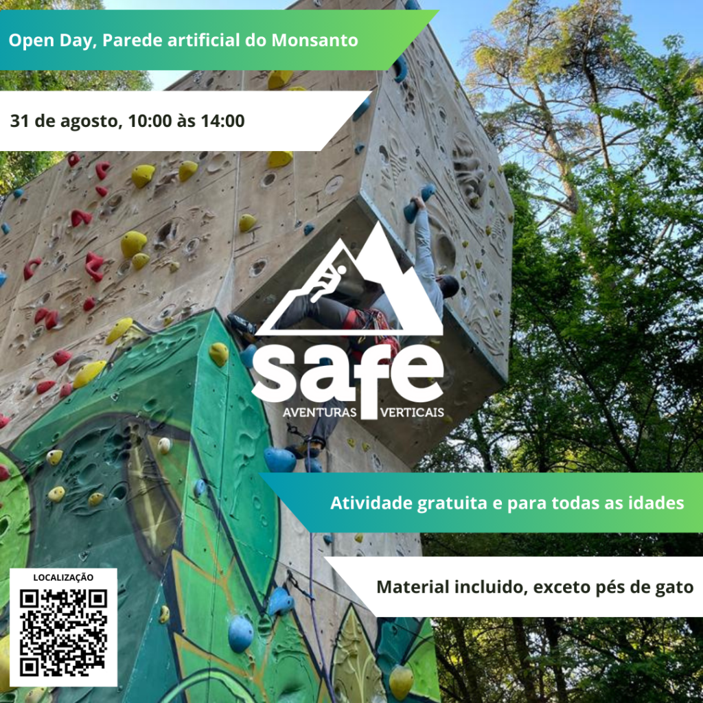 No dia 31 de agosto, vamos estar na Parede de Escalada do Parque Florestal de Monsanto, Lisboa, entre as 10h e as 14h, a orientar uma atividade aberta a pessoas sem experiência de escalada.